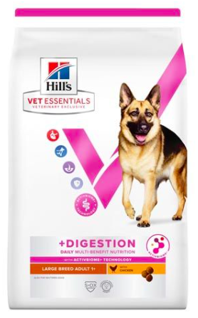 Hill’s VET ESSENTIALS + DIGESTION Adult 1+ hondenvoer met Kip is een volledig diervoeder met meerdere gezondheidsvoordelen voor volwassen honden van 1 jaar en ouder.